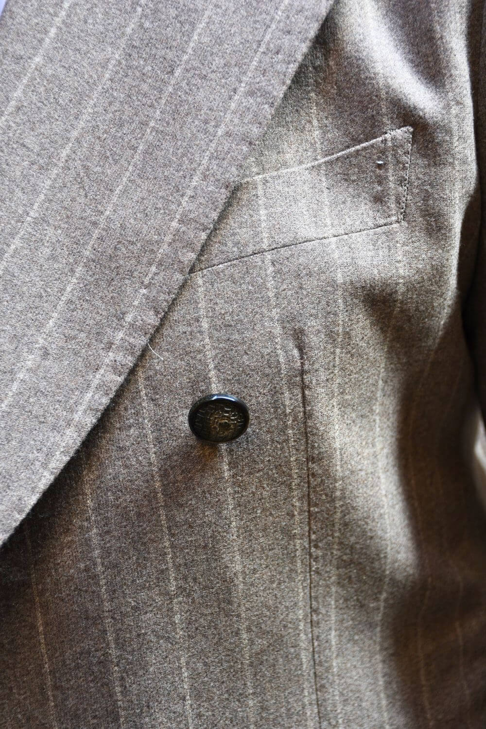 Giacca doppiopetto Pino Lerario per Tagliatore, il tessuto è una lana e cachemire gessata super strech di Carlo Barbera due tasche a toppa rever a lancia bottoni logati.